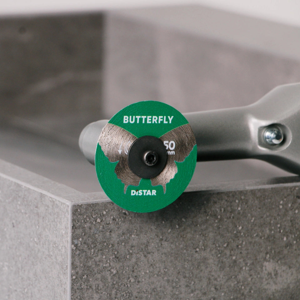 Die Distar Butterfly 50 mm ist eine hochpräzise Diamanttrennscheibe für saubere, ausrissfreie Schnitte in Keramikfliesen und Feinsteinzeug. Durch die durchgehende Diamantschicht mit 0,6 mm Stärke ermöglicht sie einen stabilen, kontrollierten Schnitt bei gleichzeitig hoher Standzeit.