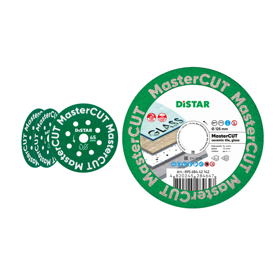 Dieses Angebot kombiniert eine große DISTAR MasterCUT Diamanttrennscheibe Ø 125 mm für den Winkelschleifer mit drei kompakten MasterCUT 45 mm Scheiben für Feinschnitte und Detailarbeiten. Damit deckst du mit einem Set sowohl lange, gerade Schnitte als auch präzise Ausschnitte und Kantenbearbeitung an Feinsteinzeug, Keramik und Glas ab.