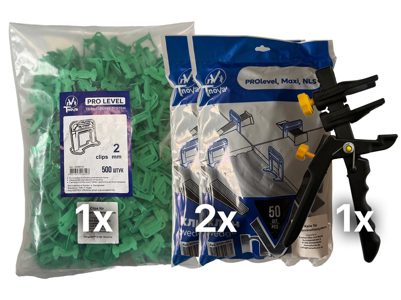Erleben Sie präzise und einfache Bodenverstellung mit dem TnoVa Fliesen-Nivelliersystem Mini-ProSet, bestehend aus 500 Zuglaschen in den Dicken 1/1,5/2/3mm, 100 Stk. passenden Fliesenkeilen und einer hochwertigen plastik Fliesennivellierzange.